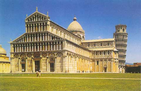 Cảnh chụp thánh đường Pisa, cùng với tháp nghiêng phía sau