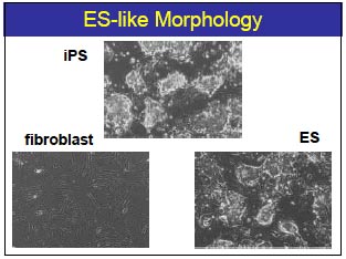 So sánh hình ảnh của iPS, tế bào xơ và tế bào gốc phôi.