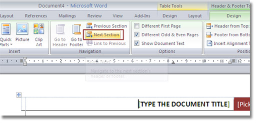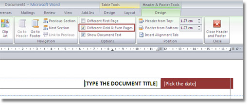 4. Phía dưới công cụ Header & Footer Tools, kích thẻ Design tab rồi kích chọn hộp kiểm Different Odd & Even Pages tại nhóm Options.