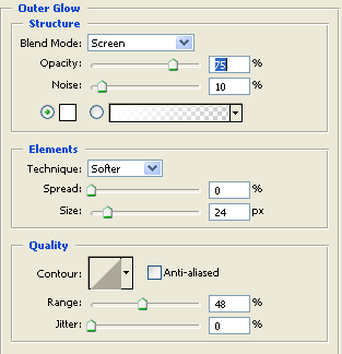 - Chọn layer "hình tròn 02" > chuột phải > Blending option > Outer Glow với các thông số sau: