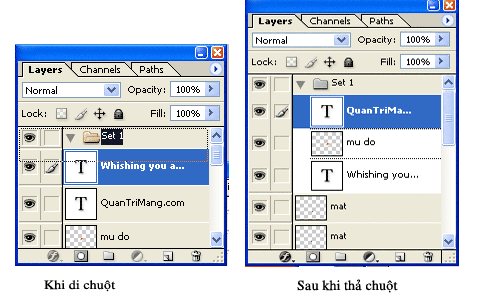 - Click một layer > giữ chuột trái và di layer đang chọn lên "set 1" và thả chuột