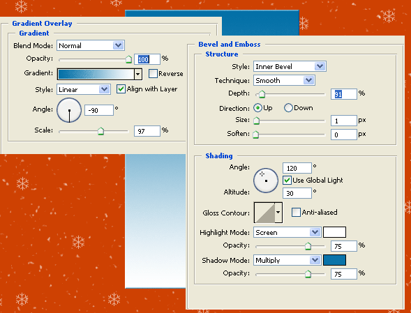- Chuột phải layer "khung thiep" > Blending option > Gradient Overlay với thông số mầu xanh (#0370A7) - mầu trắng (#fffff) > Bevel and Emboss (Style: inner Bevel, Technique: smooth, Size:1, Shadow mode: ##0370A7)