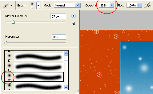 - Chọn công cụ brush > nét bút Soft Round 27 > Đặt Opacity: 63%