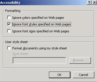 Vào Internet Options, chọn tab General, chọn Accessibility và bỏ trống hết tất cả. Thật ra là trong quá trình truy cập, người nào đó đã chọn "Ignore font styles specified on Web pages", tùy chọn này bỏ qua các kiểu font chữ đặc biệt trên web và chỉ mở các font chữ theo font chữ mặc định Times New Roman.