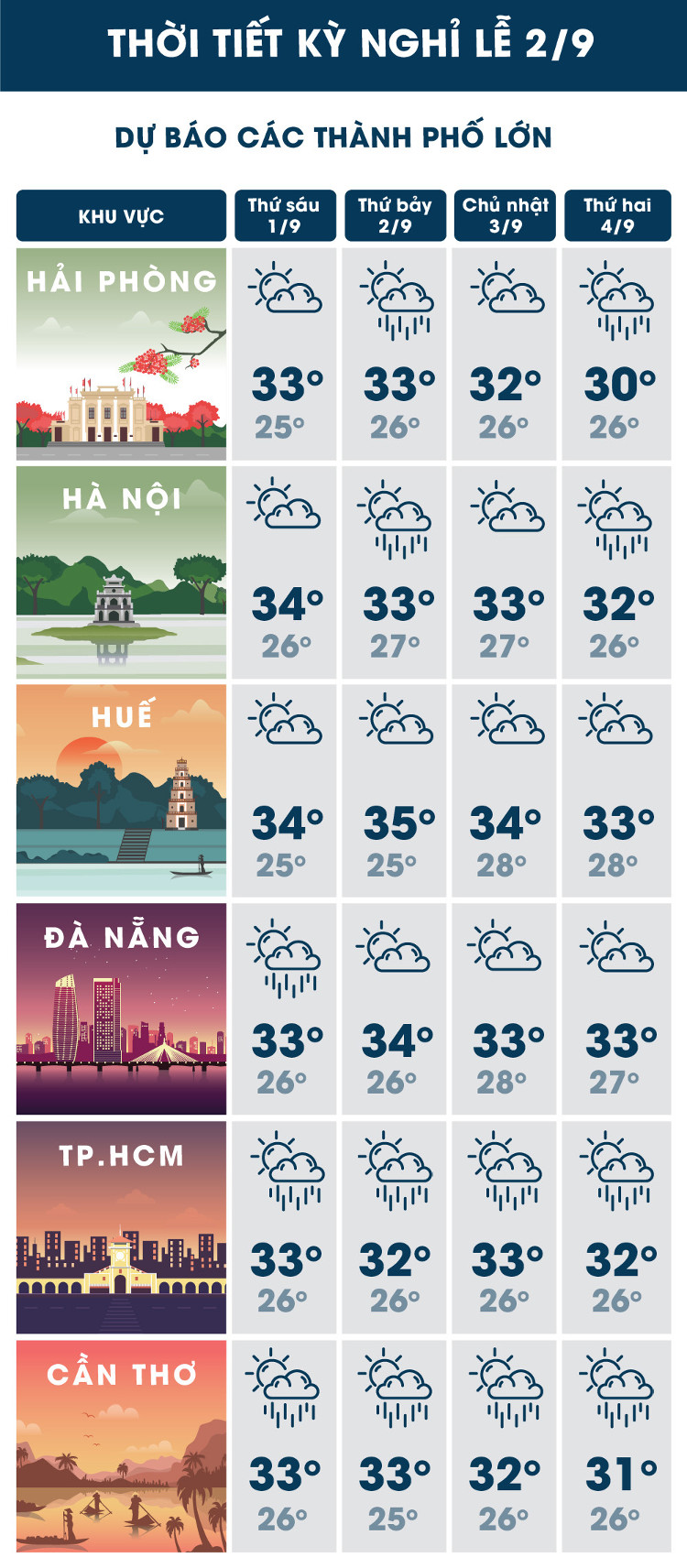 Dự báo thời tiết dịp nghỉ lễ 2/9 tại các thành phố lớn.