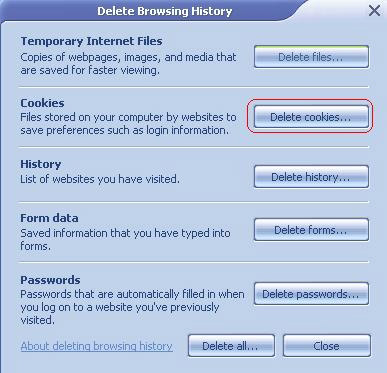 + Nếu bạn đang sử dụng Internet Explorer thì tại giao diện của chương trình, bạn click vào Tools, chọn Internet Options. Tại thẻ Genaral, ở mục Browsing History, bạn click vào nút Delete. Một cửa sổ mới sẽ được hiện ra cho bạn lựa chọn, bạn click tiếp vào nút Delete Cookies để xóa sạch Cookies đang được lưu trong IE và nhấn Close để kết thúc quá trình.