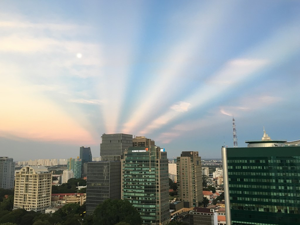 Chiều ngày 9/4, những đường nắng hình "rẻ quạt" xuất hiện bất ngờ trên bầu trời Sài Gòn, và lưu lại thời gian khá lâu. (Ảnh: Phương Kỳ Bảo).