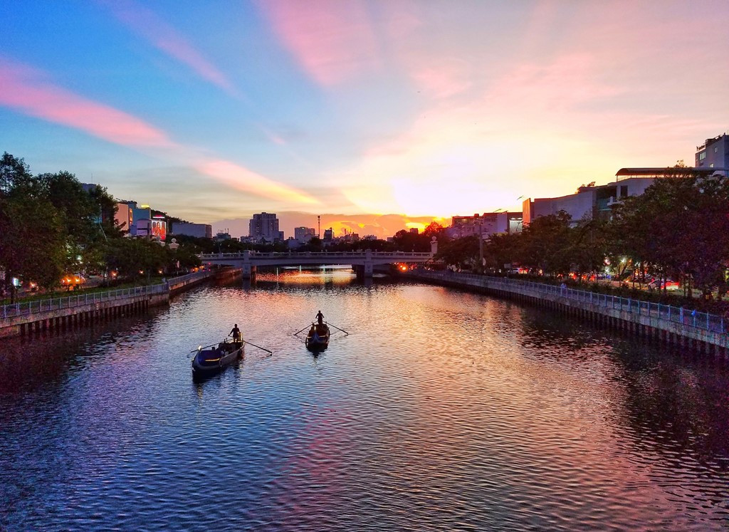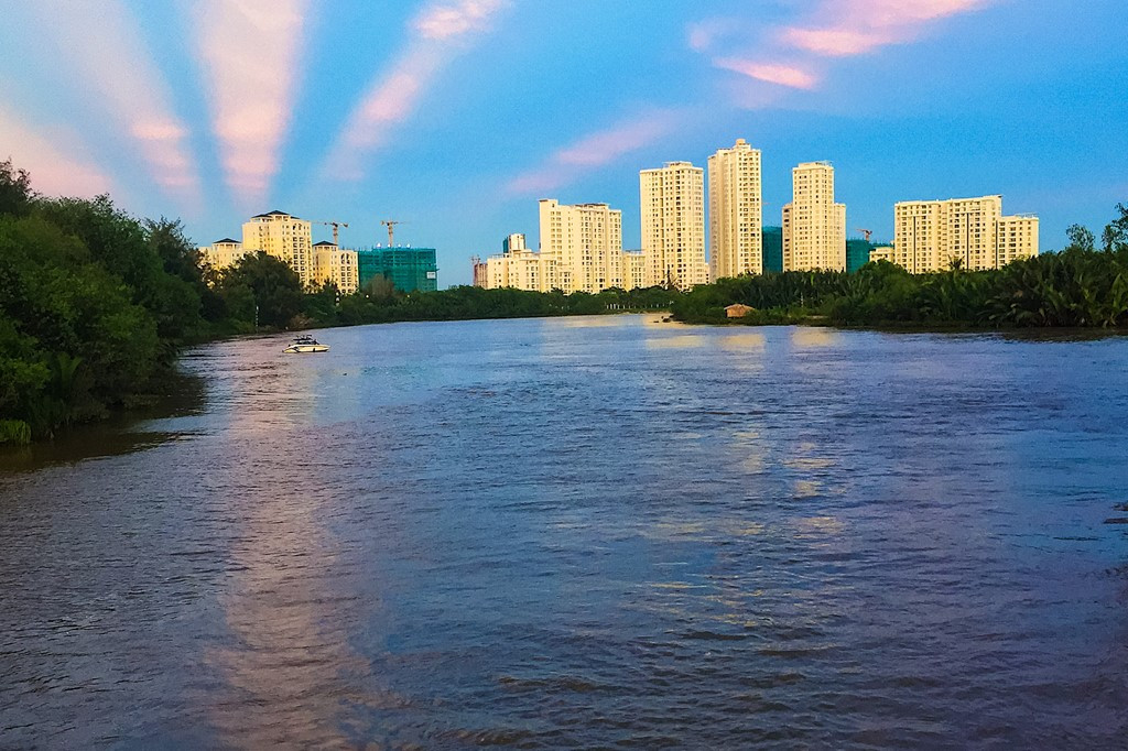 Bầu trời chia màu xanh - đỏ rực rỡ từ đại lộ Nguyễn Văn Linh. (Ảnh: ThanhTungPhoto).