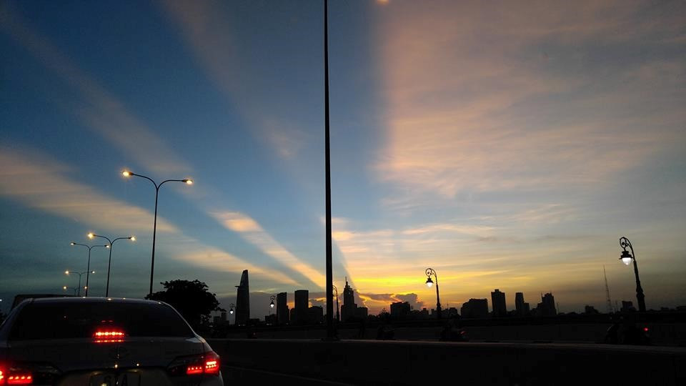 Chiều 9/4, tia nắng hình rẻ quạt xuất hiện trên bầu trời Sài Gòn, nhiều người đi đường đã chụp lại khoảnh khắc này và chia sẻ trên mạng xã hội.