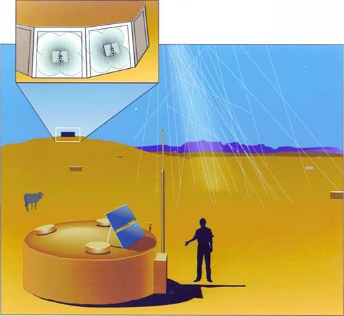 Đài Auger sẽ có tổng cộng 1.600 bình nước. Mỗi bình chứa 14.000 lít nước là một trạm dò hạt với đường kính 3,6m và cao 1,2m. Nó hoàn toàn tối đen bên trong, ngoại trừ khi các hạt năng lượng đi qua. Khi các hạt có điện tích (như muon, electron hoặc hadron) bay xuyên qua trạm dò với vận tốc nhanh hơn ánh sáng trong môi trường nước, chúng sẽ phát quần sáng Cherenkov có định hướng. Lượng ánh sáng đó được đo bằng ba ống nhân quang có đường kính 25cm bên trên trạm dò quy tụ và truyền tín hiệu về bộ xử lý. Một trận mưa sẽ làm bùng nổ ánh sáng đồng thời ở năm bình hoặc nhiều hơn. Lượng ánh sáng dò được tiết lộ năng lượng của tia vũ trụ sơ cấp. Sự khác biệt nhỏ về số lần dò tại nhiều vị trí bình quyết định hướng tới của tia vũ trụ so với mặt phẳng Trái đất. |