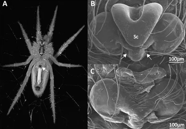 Vị trí mũi tên chỉ vào là bộ phận "scapus" kỳ lạ của nhện cái.