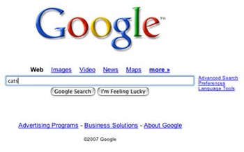 Khi Google đến với Internet vào năm 1999, thị trường tìm kiếm trực tuyến đã rất đông đảo với những tên tuổi lớn như Yahoo, Lycos, AltaVista và Inktomi. Nhưng Google vẫn thành công do được phát triển trên thuật toán xuất sắc. Tuy nhiên, một số chuyên gia lại khẳng định Google được ưa chuộng nhờ giao diện không rối mắt. Sự lạc quan và mang tính con người còn thể hiện qua phím "I'm feeling lucky" (tôi cảm thấy may mắn). Yahoo lấp đầy trang chủ với quảng cáo và kết nối, còn home page của Google vẫn chỉ là thanh tìm kiếm mộc mạc. Ảnh chụp màn hình.