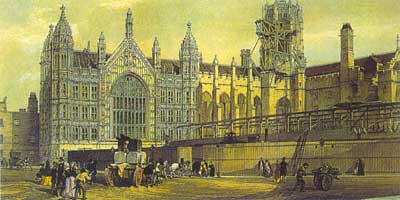Phải quyết định xây dựng lại toàn bộ, chọn kiến trúc sư trong cuộc thi quy định theo phong cách Gothic hay Phục hưng kiểu Elizabeth. Mặc dù chi tiết phong cách nghệ thuật của tòa nhà phải trở ngược về các thời kỳ trước đó để hài hòa với môi trường xung quanh, nhất là Đại sảnh Westminster và Đan viện Westminster, một cơ quan lập pháp hiện đại yêu cầu phải có điều kiện ghi cập nhật. Tháng 01/1836 người ta tuyên bố chọn Charles Barry vì sơ đồ của ông bố trí chặt chẽ, với sự đi lại hiệu quả của nhiều nhóm người sử dụng khác nhau: nhà vua, thành viên Lưỡng viện, quan chức và dân chúng. Sơ đồ thiết