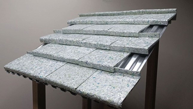 Những viên gạch này được tạo ra bằng cách cắt nhỏ và nấu chảy nhựa nhiều lớp, có trọng lượng nhẹ, không thấm nước và có thể phản xạ nhiệt.