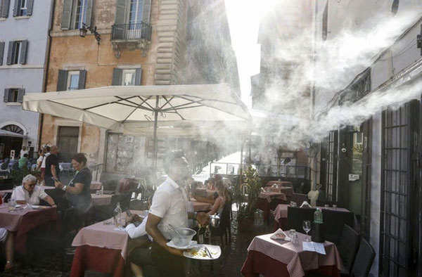 Quạt phun sương hoạt động hết công suất tại quán cà phê ở trung tâm Rome, Italy trong đợt nắng nóng với nhiệt độ lên tới hơn 34 độ C (Ảnh: AP).