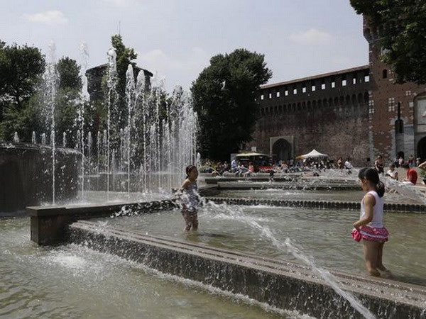 Hai bé gái chơi đùa với nước tránh nóng ở Milan, Italy. (Nguồn: AP)