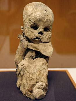 Một xác ướp trẻ con từ thời Chachapoyas được trưng bày trong bảo tàng trước khi diễn ra triển lãm.