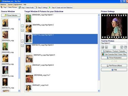 Để tạo một chương trình slideshow mới, bạn vào menu Slideshow và chọn “New Slideshow”, đặt tên cho chương trình của mình vào ô “Title of the Slideshow” và nhấp OK. Chọn thẻ Step 1: Select Pictures và nhấp vào “Picture selection” để tìm đến thư mục chứa ảnh cần trình diễn. Nhấp đúp vào bất kỳ hình ảnh nào trong thư mục đã chọn là toàn bộ hình ảnh trong đó sẽ được nhập vào mục “Picture selection”. Lần lượt chọn các hình ảnh để kéo và thả vào ô “Target Windows” để tiến hành quá trình biên tập hình ảnh theo yêu cầu. Nhập đoạn văn bản miêu tả từng hình ảnh vào ô “Text for Picture” ở mục “Picture Settings” phía bên tay phải. Trong Pictures Settings, bạn có thể chỉnh sửa độ sáng, độ tương phản, độ sắc nét, màu, xoay hình v.v tùy theo yêu cầu trình diễn bằng rất nhiều nút chức năng.