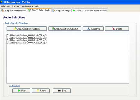 Sau khi hoàn tất quá trình biên tập ảnh, nhắp vào thẻ Step 2: Select Audio để “Add” các bài nhạc số theo dạng MP3, WAV hoặc các bài nhạc trong các đĩa Audio CD nào đó vào làm ca khúc “biểu diễn” cho đoạn slideshow của mình. Bạn có thể nghe lại các bài nhạc đã Add ngay trong Step 2 bằng cách nhấp vào nút Play.