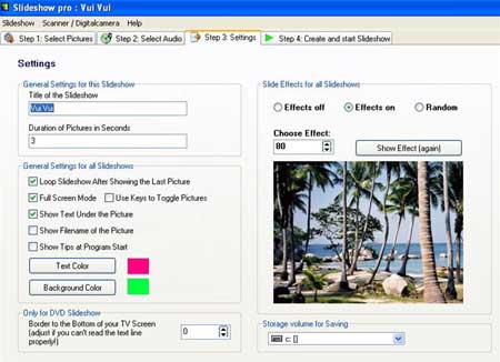 Sau khi hoàn tất quá trình nạp nhạc cho Slidesho Pro, bạn nhấp vào thẻ Step 3: Settings để chọn các hiệu ứng thể hiện hình ảnh ở mục “Slide Effect for all Slideshow”, ngoài ra bạn cũng có thể chọn màu cho văn bản thể hiện cũng như màu nền cho các dòng chữ chạy trong slideshow.