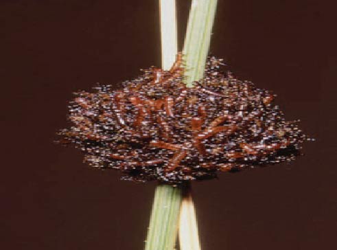 Đầu tiên, các ấu trùng hình sâu nở ra từ trứng ở các đế lá, sau đó chúng chất đống thành một khối cầu trước khi bò lên thân cây.
