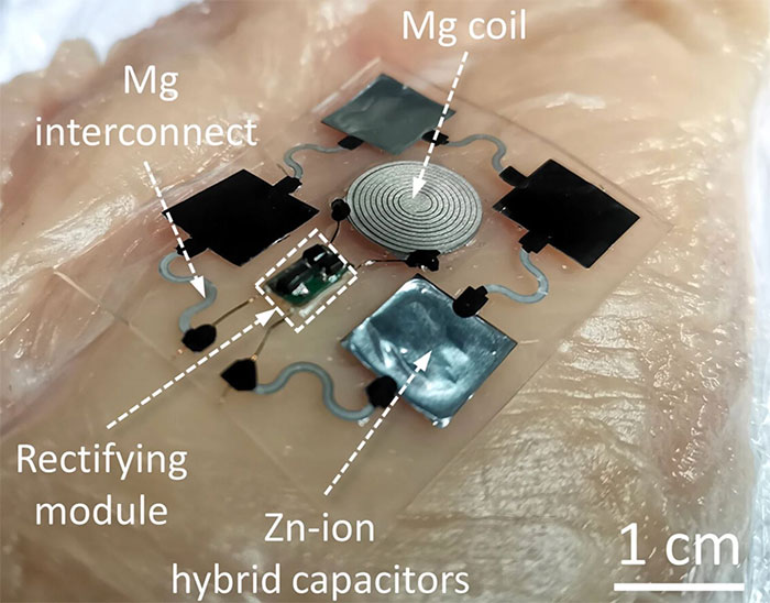 Hệ thống cung cấp năng lượng nguyên mẫu – được đặt trong bộ phận cấy ghép giống như một con chip có khả năng phân hủy sinh học linh hoạt – có thể tích hợp thu và lưu trữ năng lượng cho thiết bị. Từ đó, điện có thể trực tiếp đi qua mạch vào một thiết bị điện tử sinh học đi kèm, hoặc vào siêu tụ điện để đảm bảo nguồn điện đầu ra ổn định, đáng tin cậy sau khi sạc đầy.