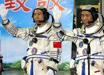 Với chuyến du hành trong vũ trụ thành công bằng tàu Thần Châu 6, hai phi hành gia Phí Tuấn Long (trái) và Nhiếp Hải Thắng đã ghi tên mình vào lịch sử ngành KH-CN vũ trụ TQ. (Ảnh: The Age) |