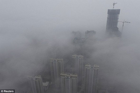 Tòa nhà được bao phủ trong một đám mây ô nhiễm tại khu vực Thanh Đảo, tỉnh Sơn Đông (Trung Quốc)
