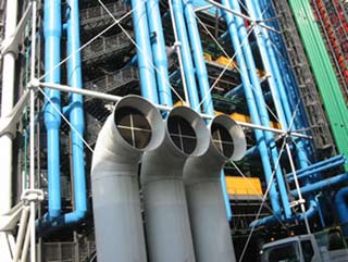 Cấu kiện chức năng như dây điện, điều hòa không khí, hệ thống ống nước và sự đi lại theo chiều thẳng đứng được các nhà thầu thiết kế âm bên trong tòa nhà phía sau ống dẫn và thân cột, phải đưa ra ngoài, có nghĩa là phải thiết kế theo công trình kiến trúc, có vẻ trang nhã và làm giảm bớt một số cấu kiện. Mã mầu sắc cho biết từng loại dịch vụ, gồm các mã màu chuẩn công nghiệp, cộng với màu trắng dùng cho kết cấu, màu đỏ dùng cho thang máy và nối đi lại, màu xanh da trời cho ống nước, màu vàng cho dây điện và màu xanh lơ hay trắng biểu thị hệ thống điều hòa không khí.