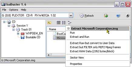 - Bạn cho đĩa XP (gốc) của bạn vào, mở IsoBuster ra chọn "thư mục" Bootable CD, nhấn chuột phải vào Microsoft Corporation.img chọn Extract Microsoft Corporation.img sau đó lưu nó vào thư mục nào đó (ví dụ:D:\bootXP).