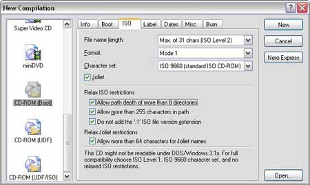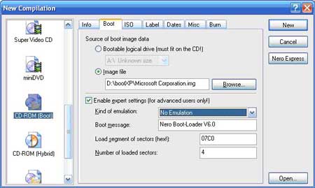 - Bây giờ bạn mở Nero ra và lựa chọn kiểu ghi đĩa CD-ROM (Boot) trong Nero Burning ROM và sau đó thiết lập các thông số giống như hình dưới đây: