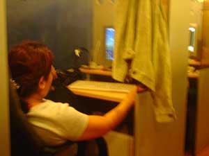 | Trong "căn phòng" 1 mét vuông ở tiệm Net, gục mặt xuống bàn là có thể ngủ đến sáng hôm sau. (Ảnh: Thu Thảo) |
