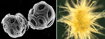 Nước biển ngày càng bị a-xít hóa có thể gây hại lên loài Emiliania huxleyi, một loài sinh vật có vỏ từ những tiểu cầu can-xi cacbonat, nhưng lại có ích đối với Trichodesmium, loài cố định ni-tơ. (Ảnh: Björn Rost; David Caron/Univ. of Southern California) |