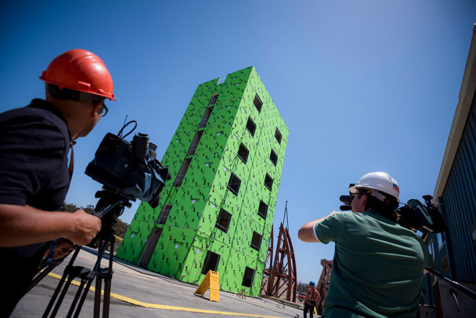 Nhóm kỹ sư đã tái tạo lại trận động đất mạnh 6,7 độ Richter ở California hồi năm 1994 thông qua bàn rung ở dưới toàn nhà. Trận động đất tại thời điểm đó đã khiến 57 người thiệt mạng và khoảng 8700 người bị thương. Tòa nhà được thiết kế theo dạng chung cư để đảm bảo tính ứng dụng của loại vật liệu này cao hơn.