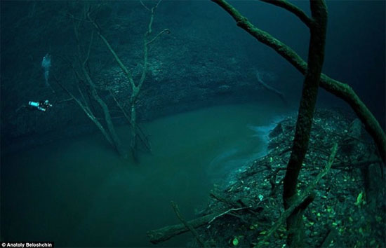 Sau 30m ở tầng nước ngọt trên cùng, những tay thợ lặn tài ba tiếp tục lặn xuống 60m nước mặn để có thể nhìn thấy dòng sông xanh thẳm nằm dưới đáy sông. Nó có dòng chảy, gợn sóng, thậm chí có cả bờ, cù lao, cây, lá khô rải 2 bên bờ, nhìn không khác gì dòng sông bình thường chảy trên mặt đất.