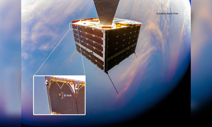 Vệ tinh MP42 của NanoAvionics với lỗ thủng rộng 6 mm ở pin mặt trời bay phía trên Cực Nam. (Ảnh: NanoAvionics).