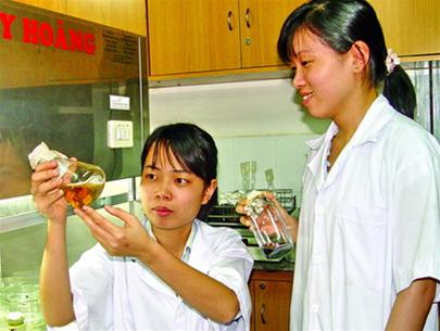 Ông Thị Anh Phương (trái) và Hồ Bảo Thùy Quyên trong phòng thí nghiệm (Ảnh: TTO)