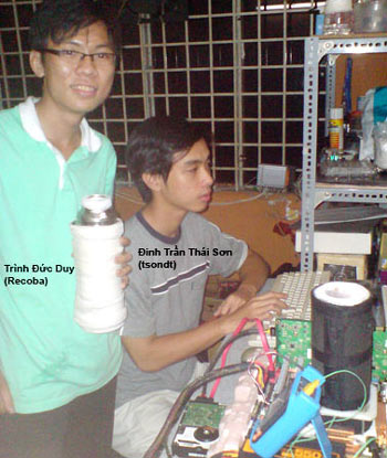 Trình Đức Duy và Đinh Trần Thái Sơn bên công trình ép xung đạt tốc độ kỷ lục. (Ảnh: Amtech.com.vn) |