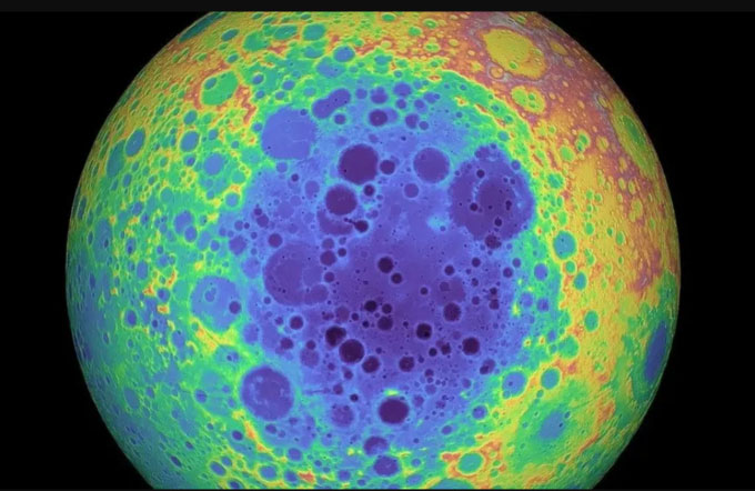 Dữ liệu độ cao cho thấy lưu vực Aitken-Nam Cực của Mặt trăng, lưu vực va chạm lớn nhất và lâu đời nhất trên Mặt trăng, có màu xanh lam và tím. (Ảnh: NASA/GSFC/Đại học Arizona).