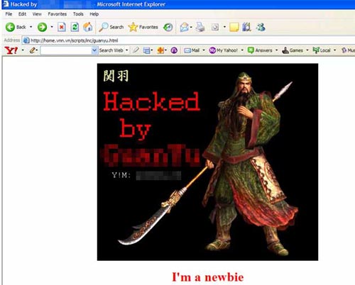 Cụ thể, trong đường link gửi qua e-mail, độc giả tên Nam cho biết khi truy cập địa chỉ http://home.vnn.vn/scripts/inc/guanyu.html thì nhìn thấy một tấm hình vẽ danh tướng Quan Vân Trường (trong truyện Tam Quốc Diễn Nghĩa) cùng với nickname YM của hacker để lại. Anh Nam cho biết đã nhận được đường link này thông qua bạn bè nhắn tin hàng loạt trên Yahoo Messenger.