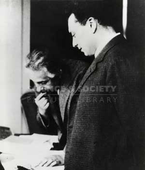 | Hai nhà khoa học: Wolfgang Pauli (đứng) và Einstein (ngồi) (Ảnh: scienceandsociety) |