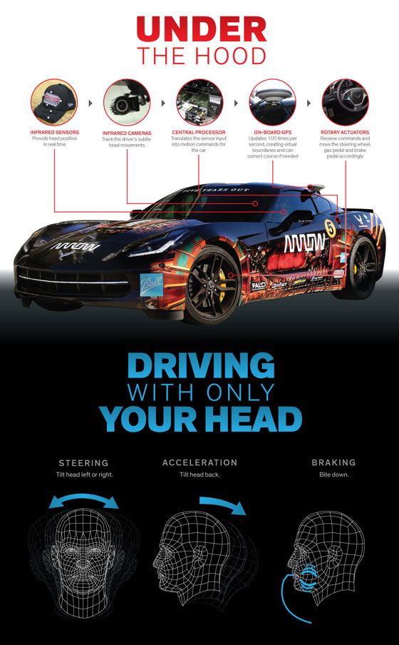 Cử chỉ xoay đầu và nghiêng đầu về phía sau sẽ giúp Schmidt chuyển hướng hoặc phanh xe. Bộ phận GPS trên xe sẽ cập nhật 1000 lần mỗi giây để điều chỉnh hướng đi khi cần thiết: khi xe cách đường biên chỉ 1 mét, GPS sẽ tự động ra lệnh cho GPU chuyển hướng đi. Đồng thời, tay đua này sẽ được hõ trợ bởi một người cùng điều khiển ngay bên cạnh. Các nhân viên quản lý ngoài đường đua cũng có thể ra lệnh dừng khẩn cấp cho chiếc Corvette C7 nói trên.