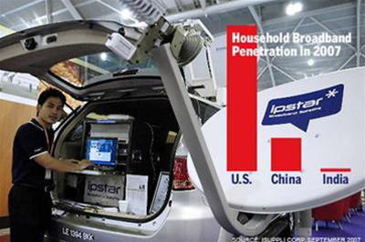 Một phương thức khác để so sánh về mức độ cạnh tranh về mặt công nghệ giữa các quốc gia là việc thâm nhập của đường truyền băng thông rộng tại các gia đình trong quốc gia đó. Điều này đặc biệt quan trọng vì băng thông rộng rất cần thiết đối với việc phát triển cả về nội dung và thương mại số trong nền kinh tế. Trong năm 2007, Mỹ hiện đang dẫn đầu với 48% số gia đình có truy cập Internet băng thông rộng, kế đến là Trung Quốc 11% và Ấn Độ rất khiêm tốn với con số 1%.