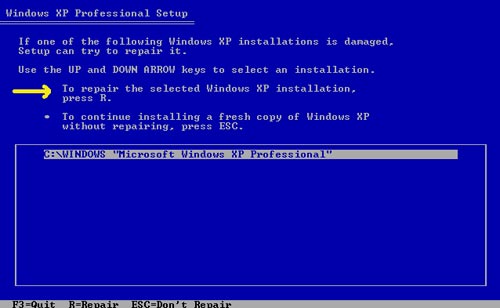 g. Danh sách chương trình cài đặt Windows XP hiện tại được đưa ra. Sau đó bạn được nhắc chọn một tuỳ chọn. Ấn phím R để bắt đầu chương trình tự động sửa chữa. Sau khi Windows XP được sửa, có thể bạn sẽ cần phải kích hoạt lại Windows XP nếu thay đổi một số thiết bị phần cứng.