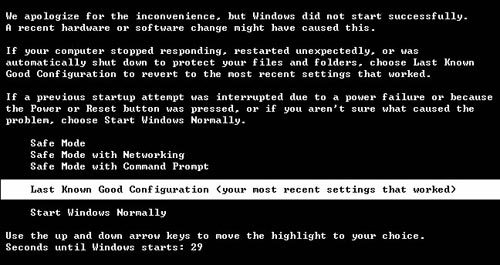 • Last Known Good Configuration sử dụng thông tin ghi lại sau lần tắt máy gần nhất của bạn. Thông tin này được dùng để phục hồi lại các thiết lập đăng ký và trình điều khiển. Do đó, bạn chỉ có thể dùng thành phần này nếu khởi động được thành công trước khi phục hồi máy.