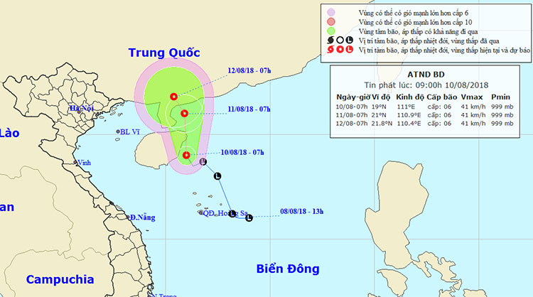 Hồi 07 giờ sáng nay (10/8), vị trí tâm áp thấp nhiệt đới ở vào khoảng 19,0 độ Vĩ Bắc; 111,0 độ Kinh Đông, ngay trên vùng biển phía Đông đảo Hải Nam (Trung Quốc). Sức gió mạnh nhất vùng gần tâm áp thấp nhiệt đới mạnh cấp 6 (40-50km/giờ), giật cấp 8. Phạm vi gió mạnh cấp 6, giật cấp 8 khoảng 50km tính từ tâm áp thấp nhiệt đới.