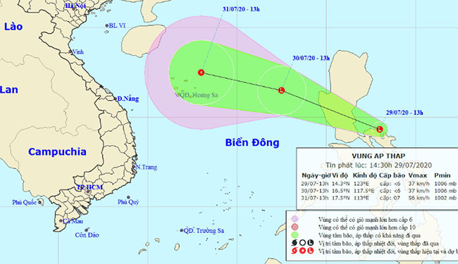 Dự báo trong 24 giờ tới, vùng áp thấp di chuyển theo hướng Tây Tây Bắc, mỗi giờ đi được khoảng 25km và đi vào biển Đông. Đến 13h ngày 30-7, trung tâm vùng áp thấp ở khoảng 16,0-17,0 độ Vĩ Bắc; 117,0-118,0 độ Kinh Đông, cách quần đảo Hoàng Sa khoảng 570km về phía Đông.